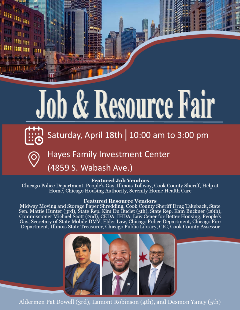 Alderman Pat Dowell (3rd), Lamont Robinson (4th), and Desmon Yancy (5th) are hosting a special Job and Resource Fair. Attendees at the fair will be able to speak directly with potential employers, and receive important housing, legal, and employment information, as well as government services, from participating resource partners.